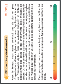 Pour boucler la mécanique de gameplay, nous avons alors proposé pour chaque dilemme des conséquences chiffrées sur chacun des 4 axes « cibles ». Si par exemple l’équipe décide d’annuler une rétrospective pour finir un développement, peut être que la qualité du Produit sera légèrement supérieure en fin de Sprint (+1 en « Valeur du Produit »), mais l’équipe va perdre en opportunité de s’améliorer (-1 en « Efficacité opérationnelle » et -1 en « Maturité Agile »). Nous avons ici pris des hypothèses en proposant des conséquences, mais l’animateur du jeu peut parfaitement adapter les résultats en fonction du contexte de l’équipe.
