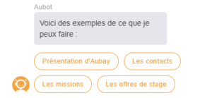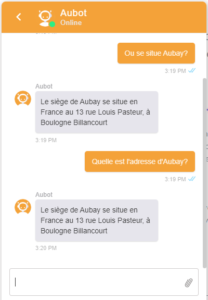 Nous avons, avec le pôle communication de Aubay, enrichi la base de données du chatbot. À ce jour, Aubot est capable de traiter plus de 150 sujets à propos de Aubay. Il est possible de lui demander par exemple le chiffre d’affaire de la société, le domaine d’activité de Aubay, le nombre de salariés ou encore un contact au sein de l’entreprise. Aubot dispose d’une base de données plus large que celle du site internet.
