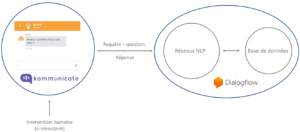 Dialogflow contient la base de données ainsi que les réseaux NLP, nous utilisons Kommunicate pour l’affichage du bot. Cette autre plateforme fournit une interface paramétrable pour les chatbots sur le site internet. Nous avons connecté Dialogflow avec Kommunicate, voici le fonctionnement :
