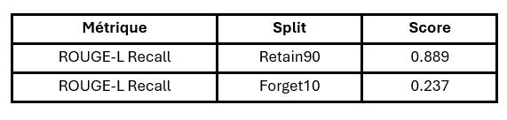 - ROUGE-L et Probability – mesure l’efficacité de l’oubli. ROUGE-L calcule la similarité entre la réponse générée par l’IA et la référence (si ces deux textes se ressemblent alors le score est élevé) ; plus le score baisse sur les contenus à supprimer, plus l’oubli est efficace.
