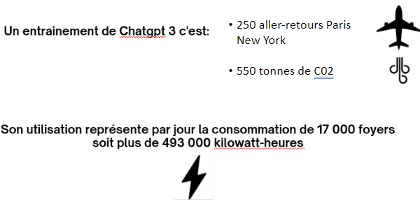 L’intelligence artificielle est au cœur des débats concernant sa consommation d’énergie et son danger pour notre planète. En effet un entrainement de chatgpt3 correspond à 250 allers-retours Paris/New-York en avion soit 550 tonnes de CO2 rejetées.