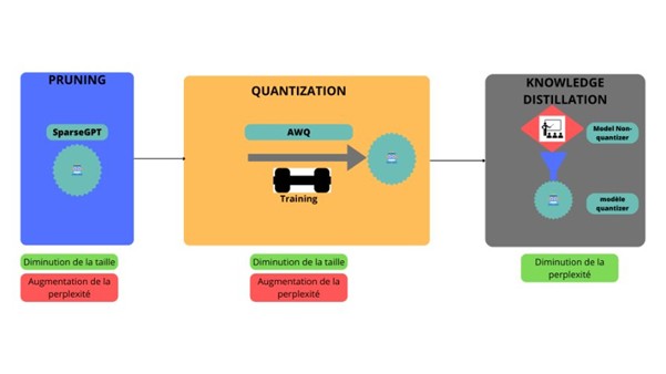 • Réduction maximale de la taille et des ressources : En combinant ces techniques, on obtient une réduction significative de la taille du modèle et des ressources nécessaires à son entraînement et à son déploiement.
