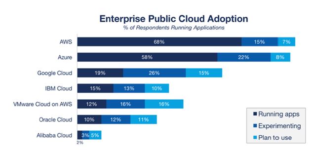 Comme le montre le graphe, le Cloud le plus adopté est AWS car il est LE précurseur du Cloud. Ensuite vient Azure qui essaie de rattraper son retard en proposant une interface plus métier par rapport à AWS et Google Cloud essayant d’être le plus transparent en terme de prix par rapport à ses concurrents.